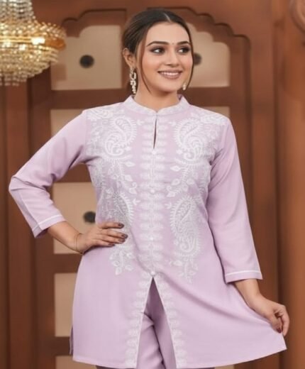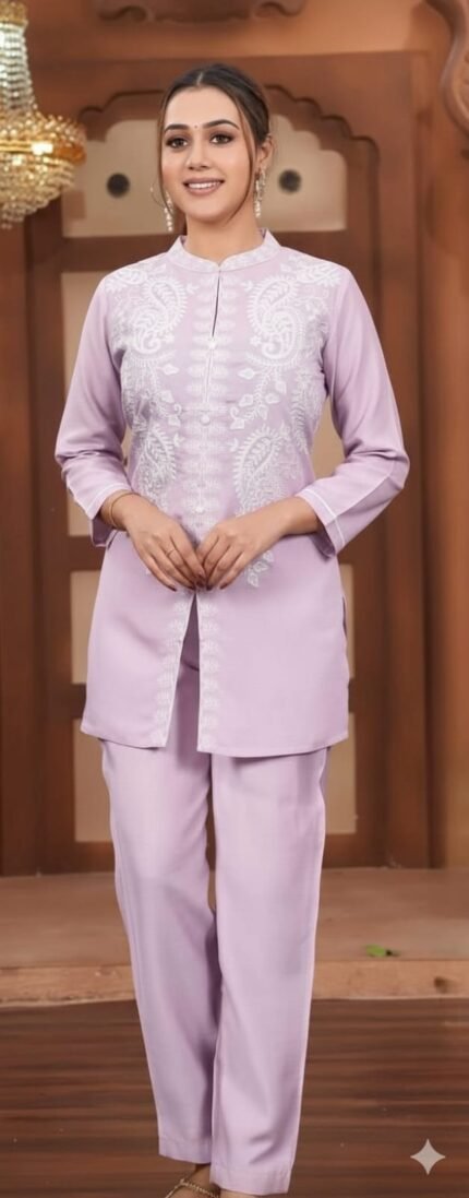 Cotton satin finish Co-ord set with embroidery detailing on the half top