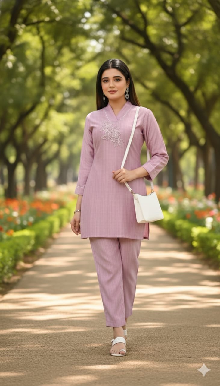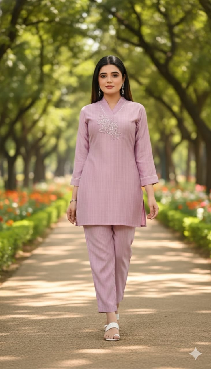 Step into effortless elegance with this viscose dobby co-ord set, featuring beautiful patch embroidery on the front and intricate cording detail around the neckline. Crafted from soft, breathable viscose fabric, it’s perfect for both casual outings and semi-formal occasions.